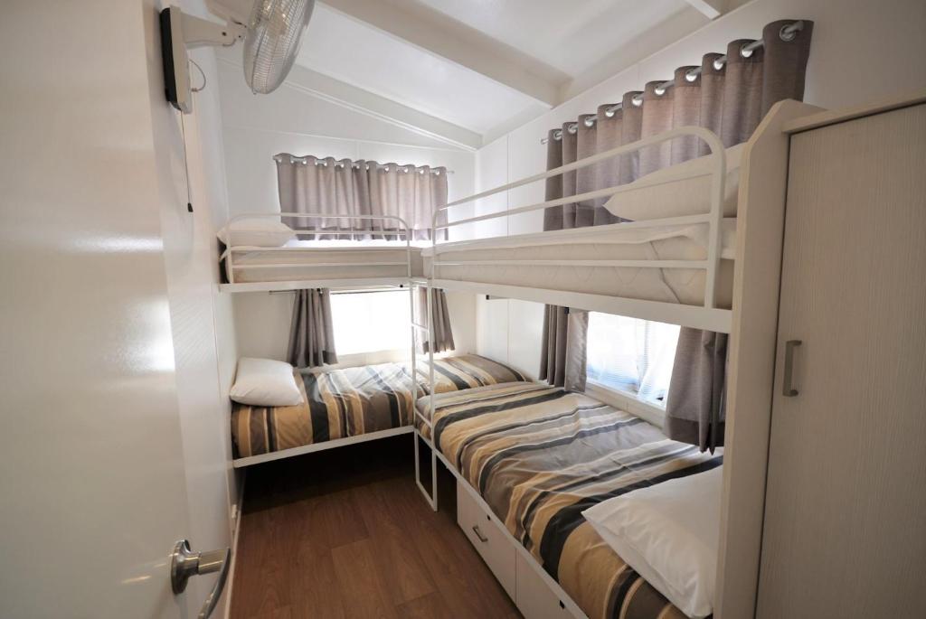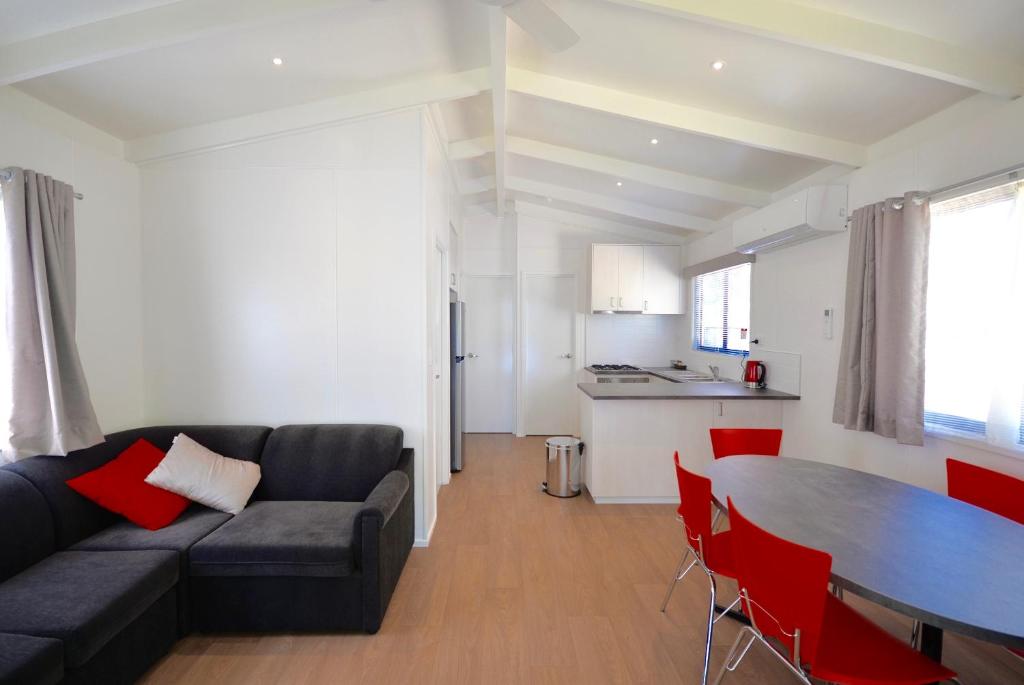 This cabin offers a spacious and comfortable stay with a view of the river, featuring two bedrooms separate from the main living and dining area. The master bedroom has a queen bed, while the second bedroom has two sets of bunk beds. All beds come with sheets, doonas, pillows, and towels. The kitchen is fully equipped with a microwave, full oven, fridge, crockery, cutlery, saucepans, kettle, and toaster. Additionally, the cabin includes a sofa, dining table, and chairs.