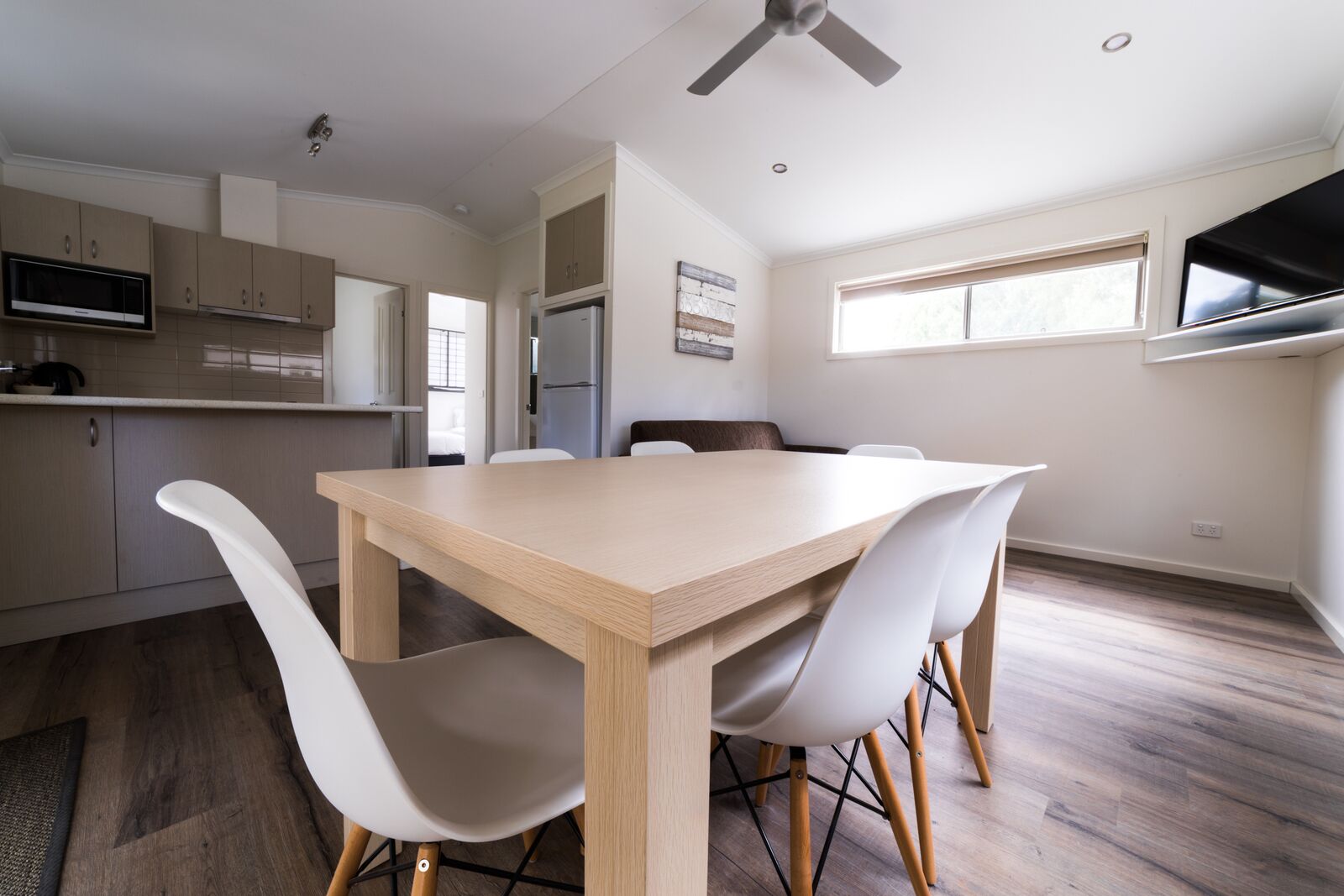 The Westerner Henty Villa, with a large deck and private BBQ offering stunning river views, can sleep up to seven people. It features a queen bed in the main bedroom, and two king single beds (convertible to a king bed on request) with a fold-up king single bunk in the second bedroom, plus a sofa bed in the living area.