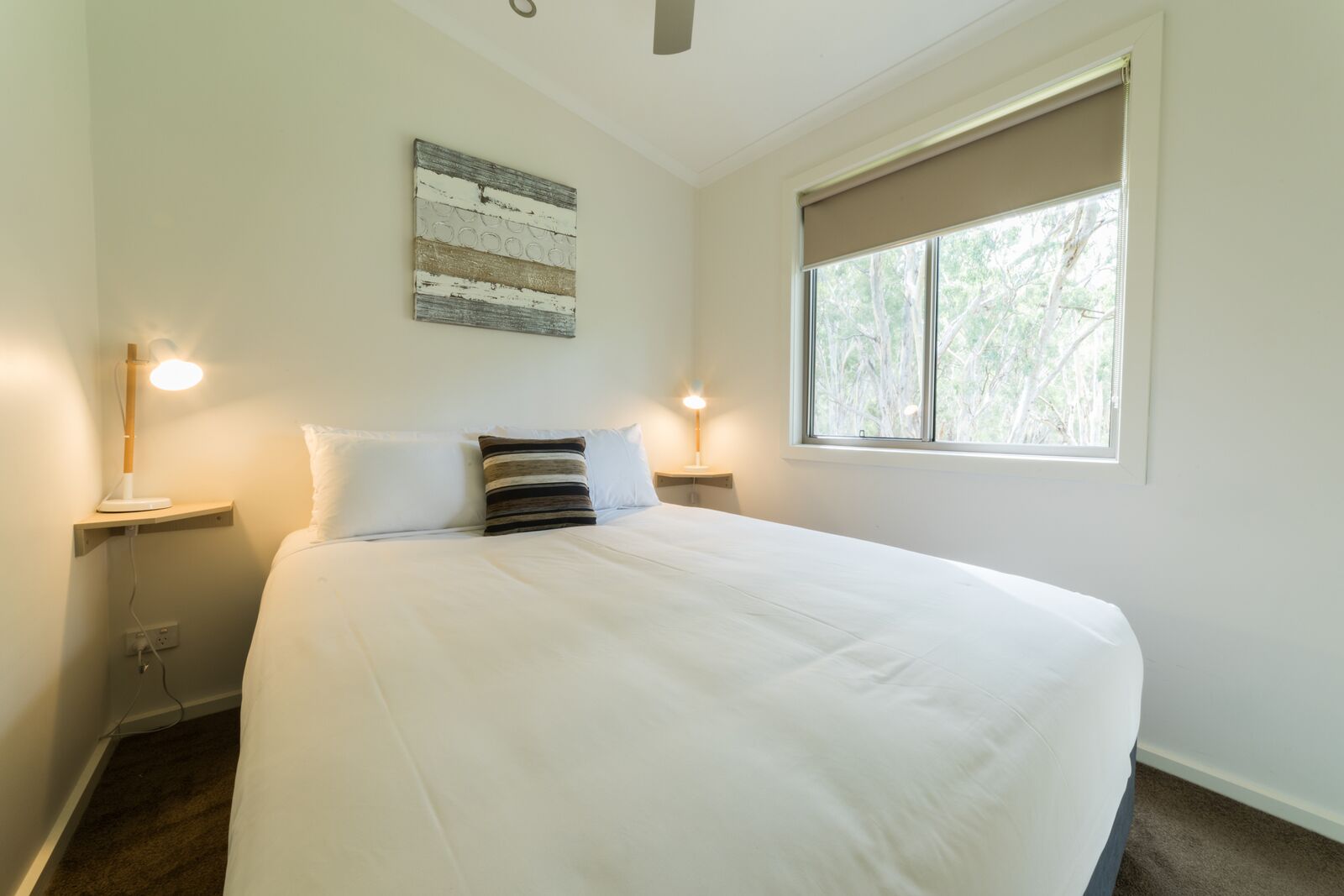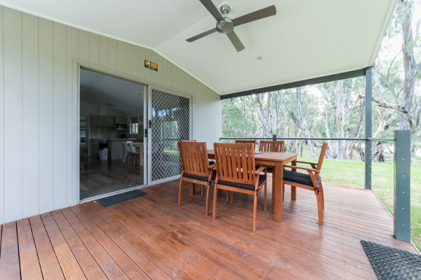 The Westerner Riverview Villa features a large deck with a private BBQ and stunning river views. It can sleep up to eight people, with a queen bed in the main bedroom, four single bunk beds in the second bedroom, and a sofa bed in the living area.