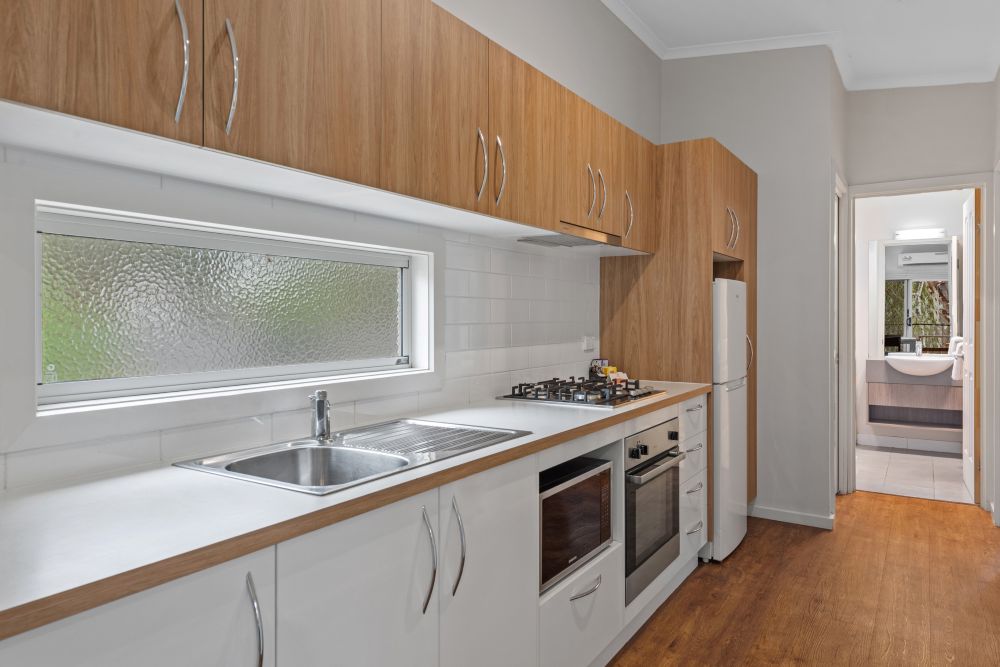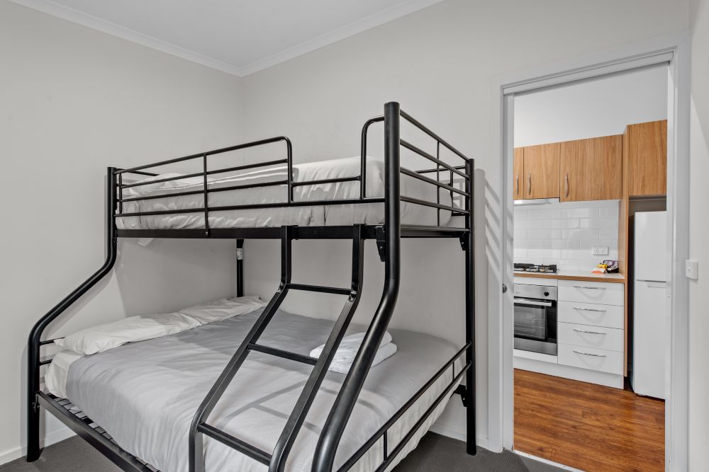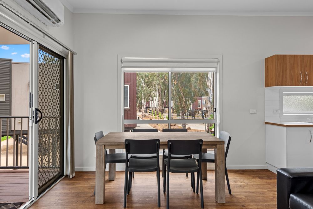 The Deluxe Cabin has two bedrooms with a lounge and dining area, bathroom and a full kitchen. Sleeps 5 (maximum 5).