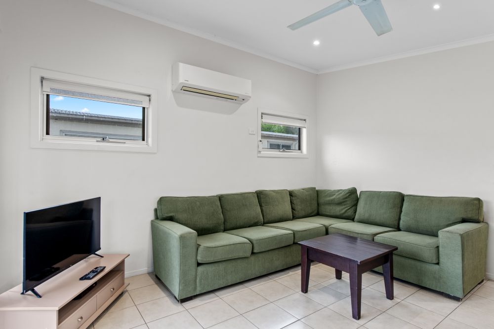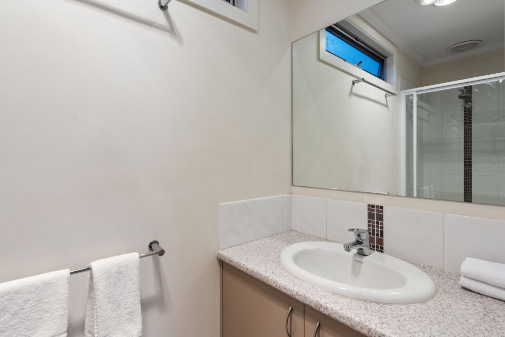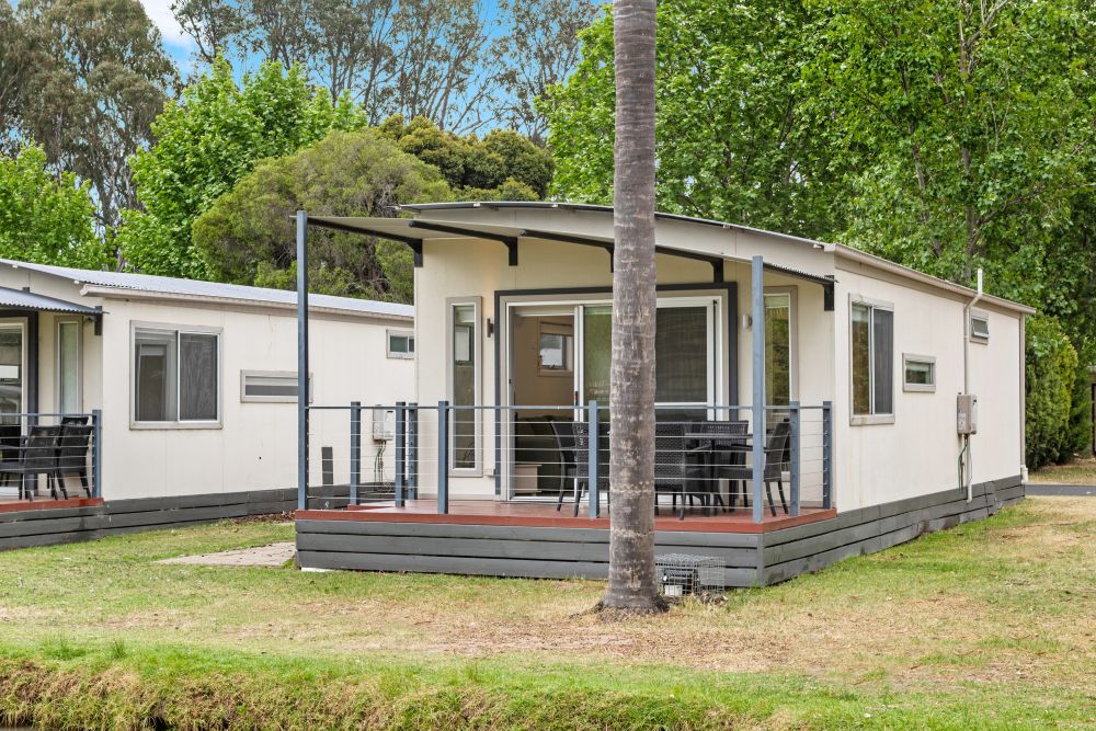 The Deluxe Cabin has three bedrooms with a lounge and dining area, ensuite and a full kitchen.