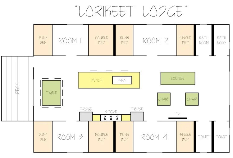 This lodge has four bedrooms, containing three beds in each with two separate toilets and two separate bathrooms. Ideal for large bookings and shared accommodation, with the ability to sleep 14 people.