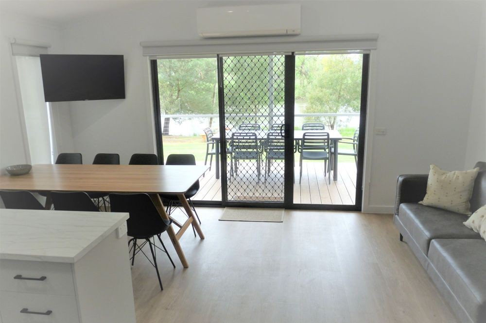 Full River Frontage and a veranda with outdoor setting to enjoy the uninhibited views the main Queen bedroom with private ensuite and TV, 2nd bedroom - Double bed with TV, 3rd bedroom- 2 x bunk sets, separate bathroom, separate toilet, kitchen with small dishwasher, comfy couch in living area.