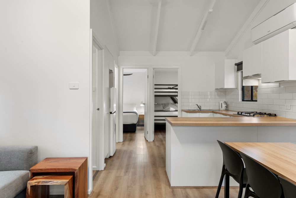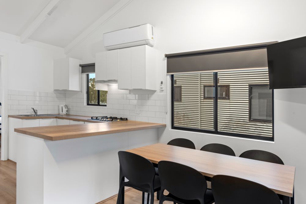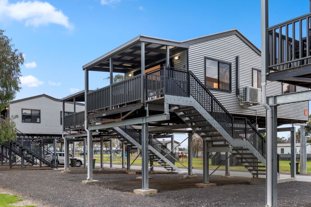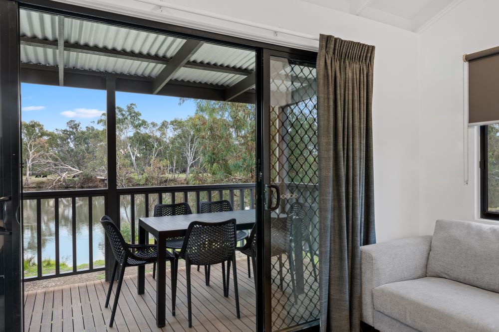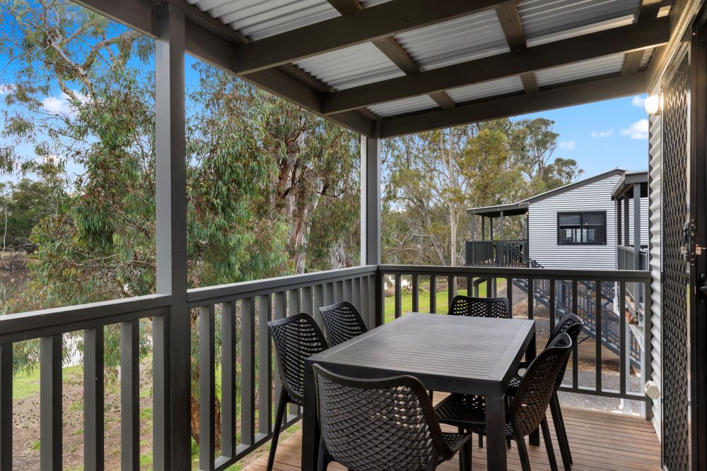 The Superior Riverside Cabin is raised 2.4m with 18 stairs to access the cabin, has two bedrooms with a lounge and dining area, bathroom and a full kitchen. With great views of the Goulburn River.