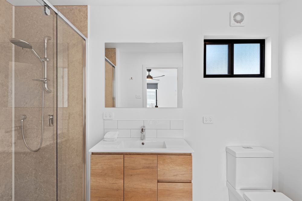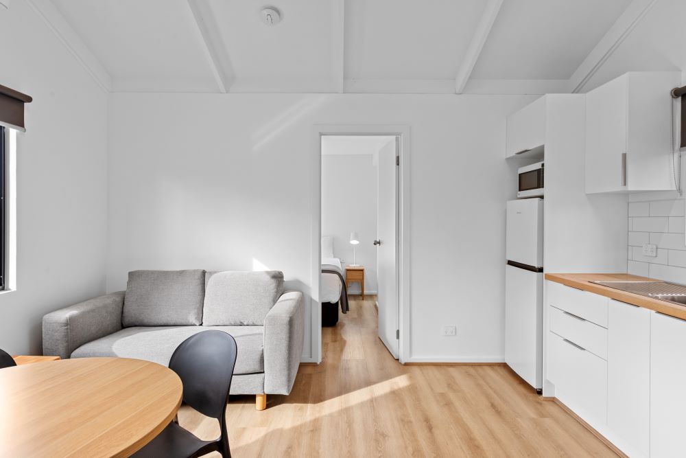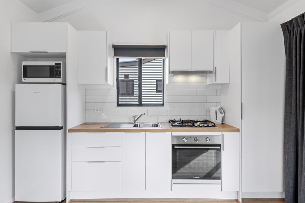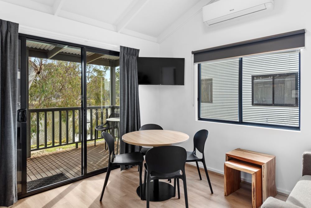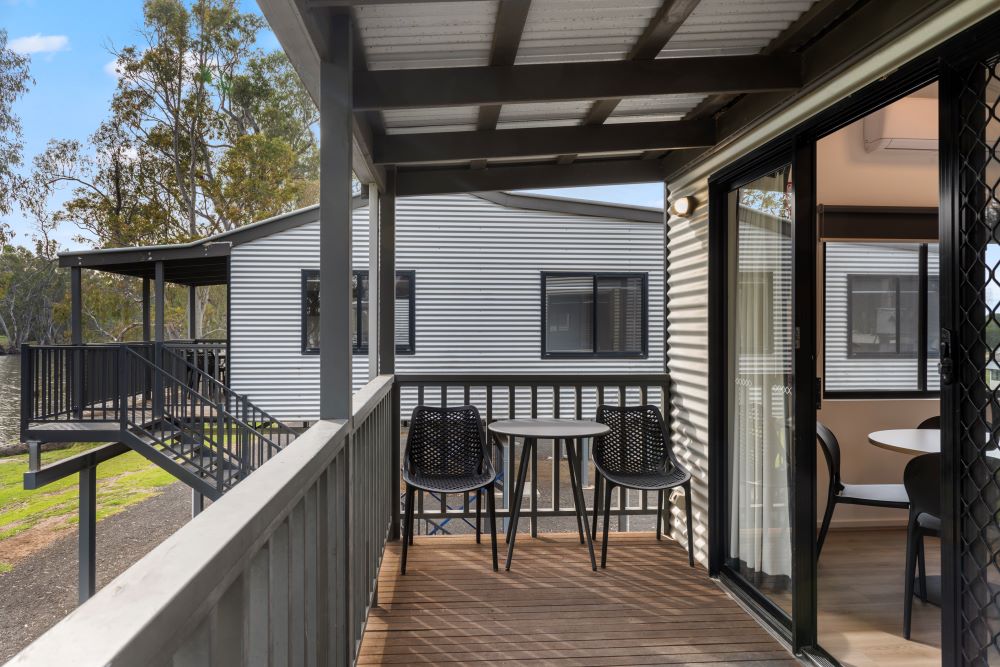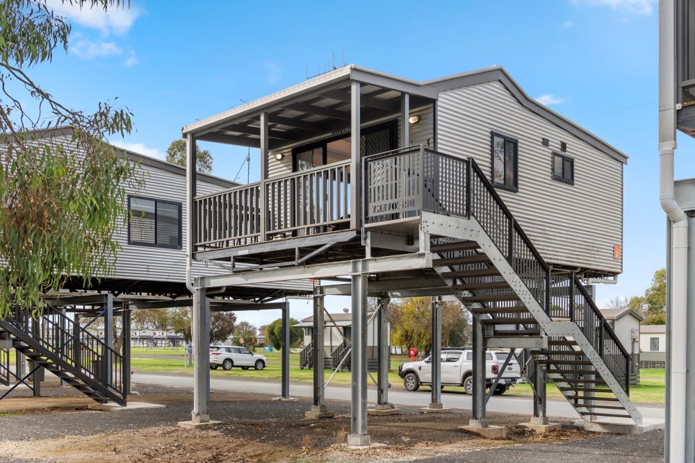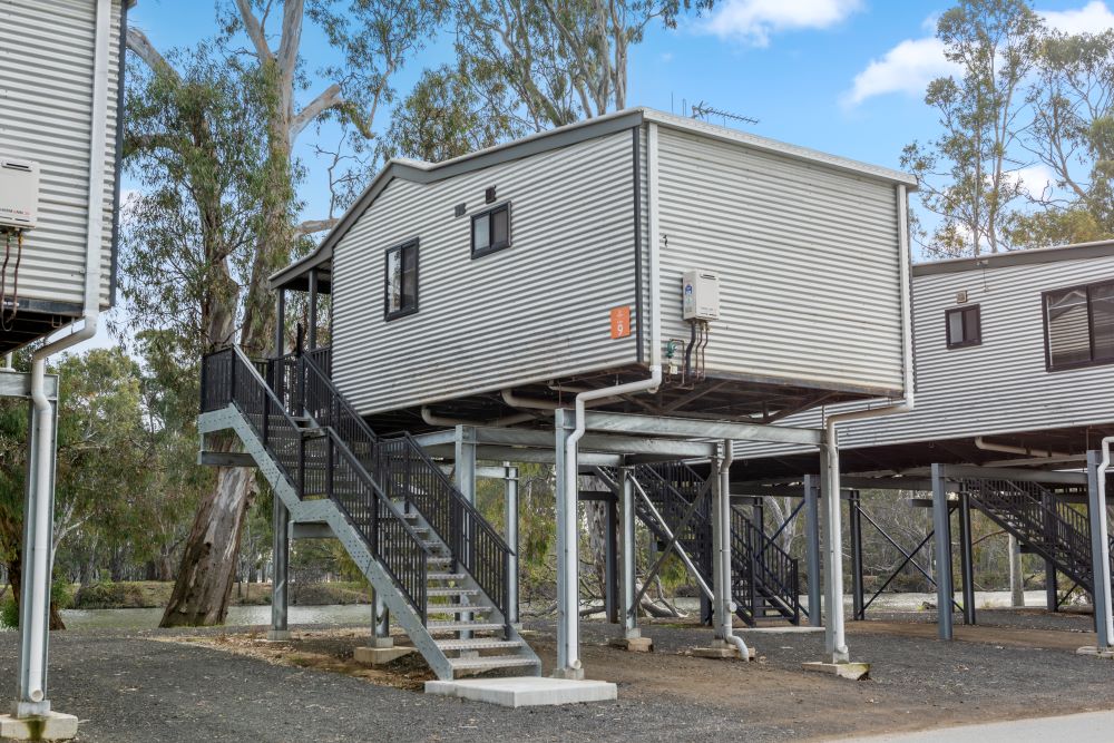 The Superior Riverside Cabin is raised 2.4m with 18 stairs to access the cabin and has one bedroom with a lounge and dining area, ensuite and a full kitchen.