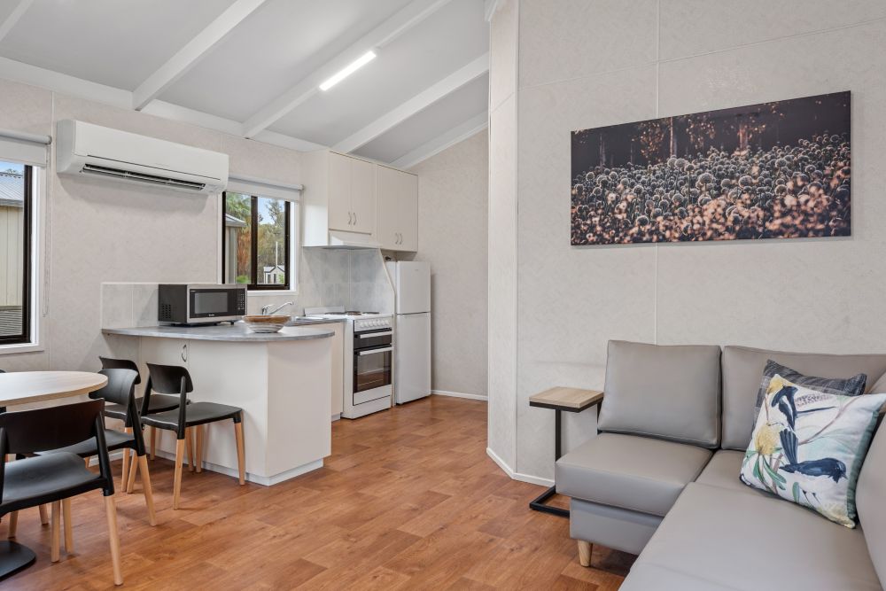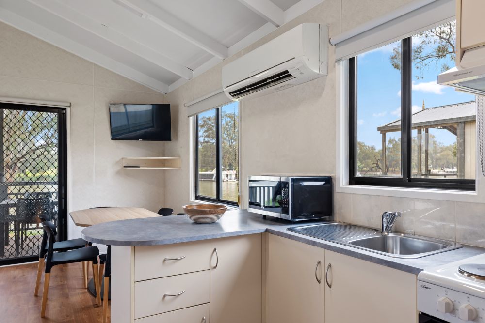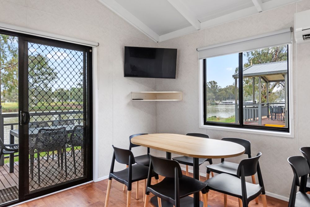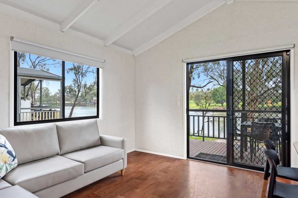 Take the entire family away when you book our largest riverside cabin. Enjoy your airconditioned comfort, a private river view balcony and large living and dining areas that will have you feeling relaxed as soon as you put your bags down. Two double beds and two double bunks means there is space for everyone here and your own kitchen and bathroom makes this a fully self-contained family getaway.